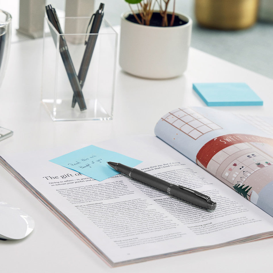 The Monochrome Titanium features an attractive gunmetal lacquer finish with shiny black trimmings. Refill with Parker Rollerball Pen Refills.